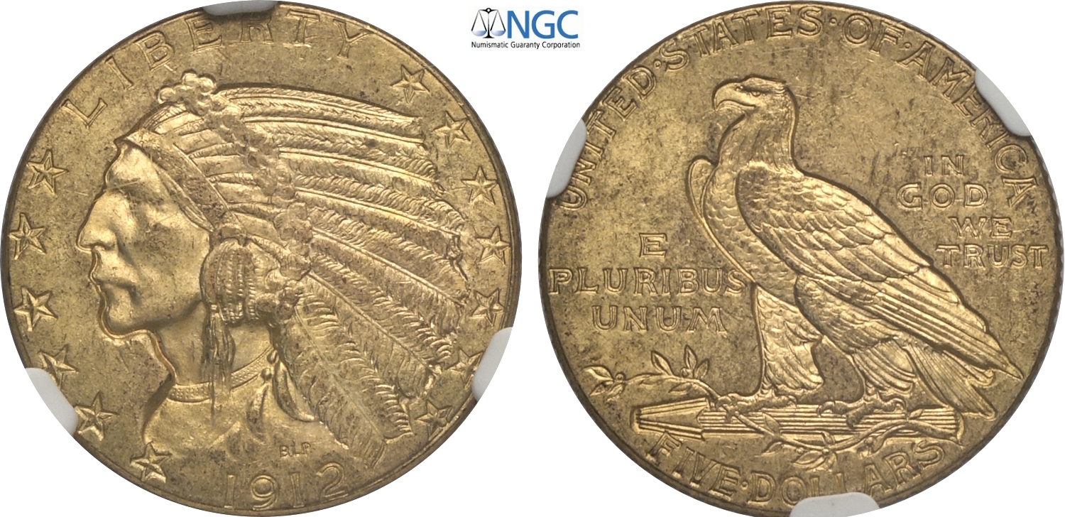 United States of America, Federal Republic (1776-), Indian Head half eagles, 5 Dollars 1912, Philadelphia mint, Au 21,6 mm, 8,36 g, in Slab NGC MS63