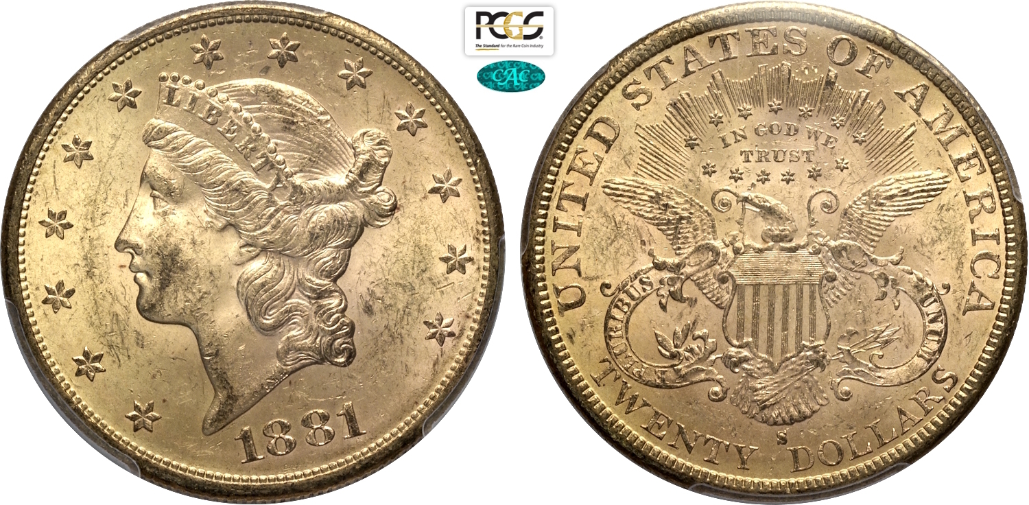 United States of America, Federal Republic (1776-), Liberty Head double eagles, 20 Dollars 1881-S, San Francisco mint, Au 34,1 mm, 33,43 g, in Slab PCGS/CAC MS62
