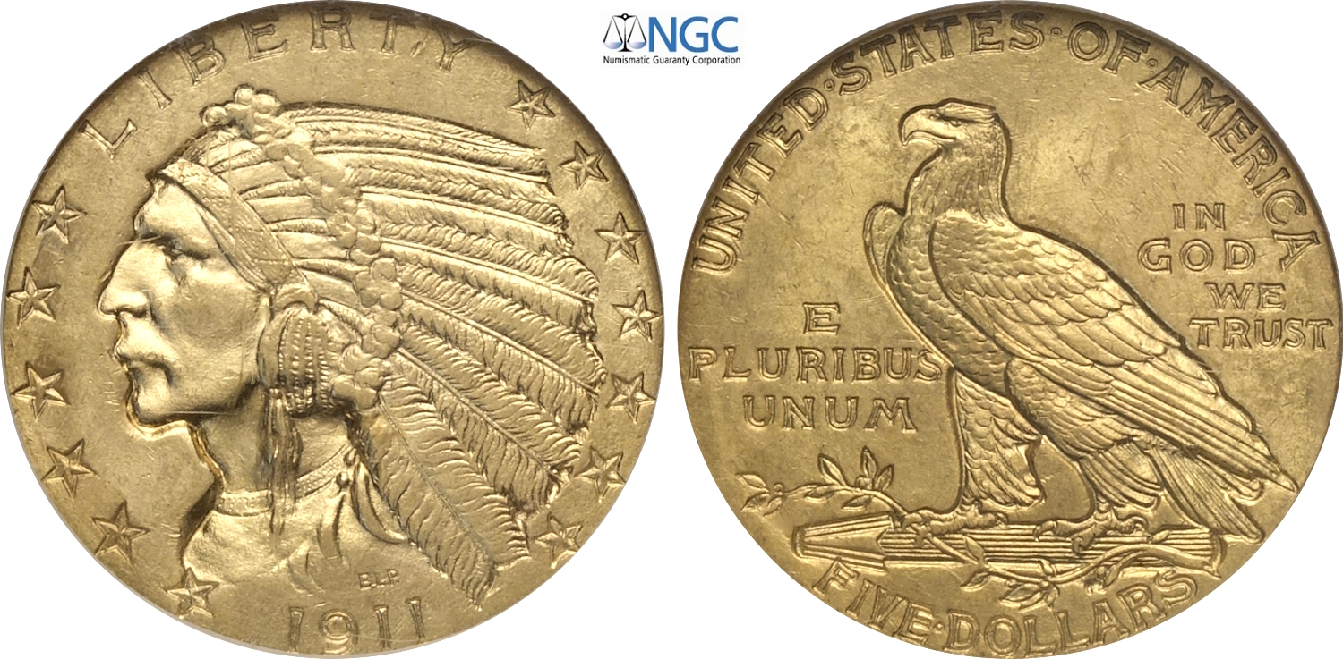United States of America, Federal Republic (1776-), Indian Head half eagles, 5 Dollars 1911, Philadelphia mint, Au 21,6 mm, 8,36 g, in Slab NGC MS64