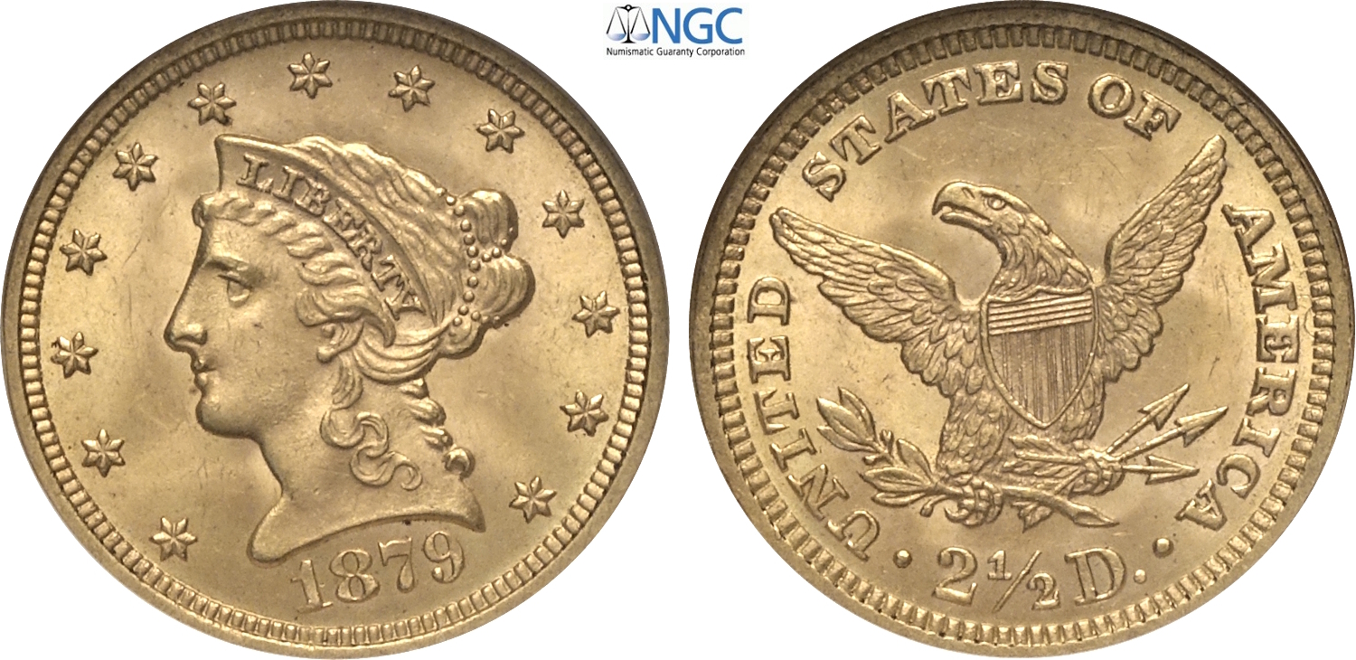 United States of America, Federal Republic (1776-), Coronet Head quarter eagles, 2,5 Dollars 1879, Philadelphia mint, Au 18 mm, 4,18 g, in Slab NGC MS65 (only 8 coins are graded higher)