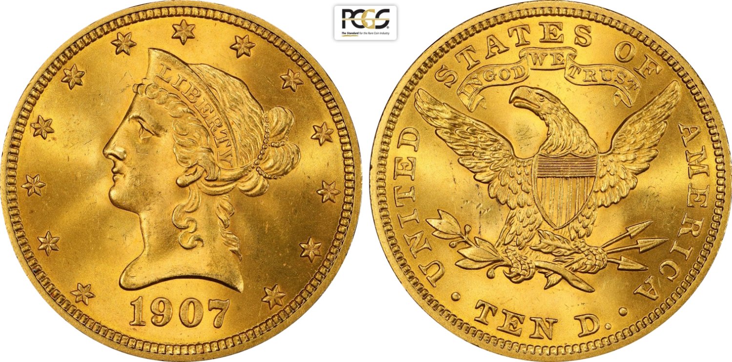 United States of America, Federal Republic (1776-), Coronet Head eagles, 10 Dollars 1907, Philadelphia mint, Au 27 mm, 16,72 g, eccezionale, in Slab PCGS MS65 (only 5 coins are graded higher)