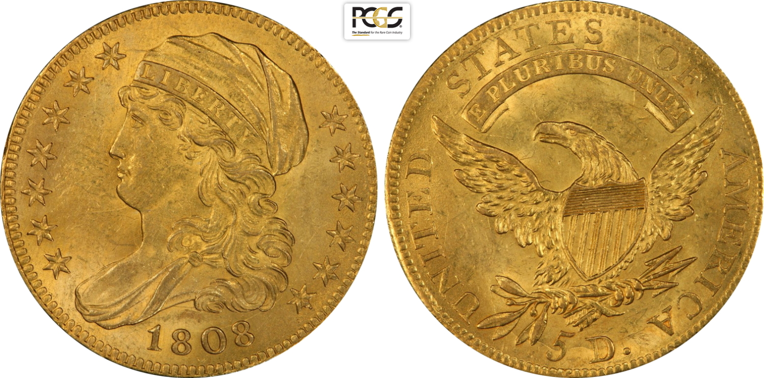 United States of America, Federal Republic (1776-), Turban Head half eagles, 5 Dollars 1808, Philadelphia mint, Au 25 mm, 8,36 g, in Slab PCGS MS63