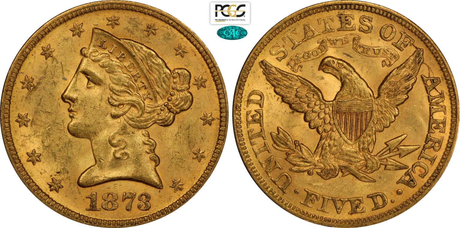 United States of America, Federal Republic (1776-), Coronet Head half eagles, 5 Dollars 1873 Closed 3, Philadelphia mint, Au 21,6 mm, 8,36 g, ex the Fairmont collection, in Slab PCGS/CAC MS63+ (only 10 coins are graded higher)