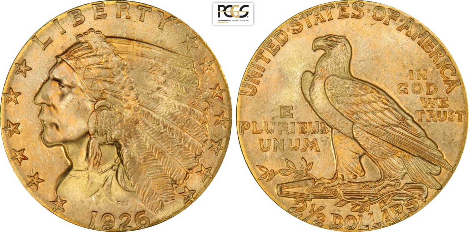 United States of America, Federal Republic (1776-), Indian Head quarter eagles, 2,5 Dollars 1926, Philadelphia mint, Au 18 mm, 4,18 g, ex Donald A Kutz collection, di eccezionale qualità, in Slab PCGS MS66 (only 3 coins are graded higher)
